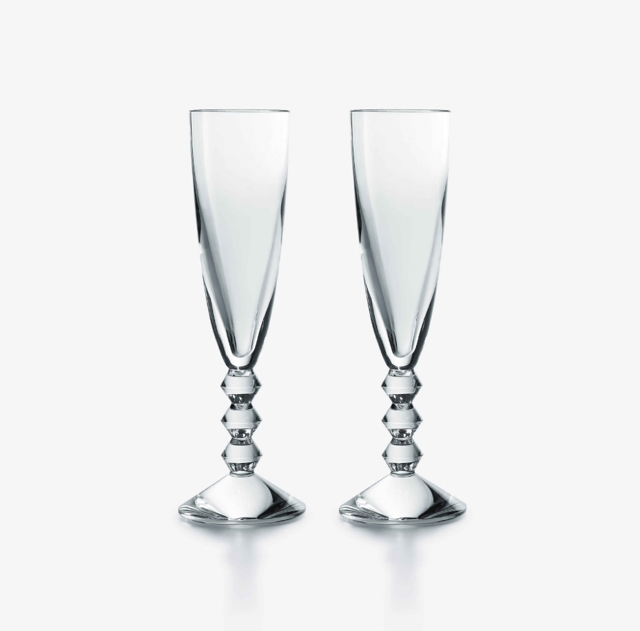 The unique bevel cut stem, designed for Baccarat by Savinel & Rozé, makes sipping bubbly all the more exceptional. The angularity of the lower half is artfully juxtaposed with the tall smoothness of the prolonged columnar bowl. The champagne flutes come in a set of two. The Vega collection also includes the Vega Flutissimo, which is a slight variation on this Vega champagne flute, in addition to the Vega martini glass and other bar and tableware.