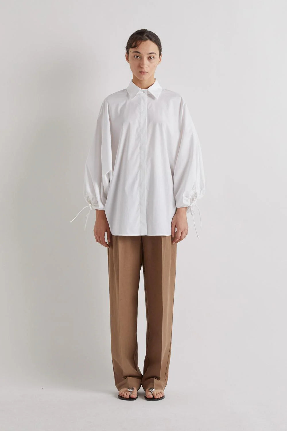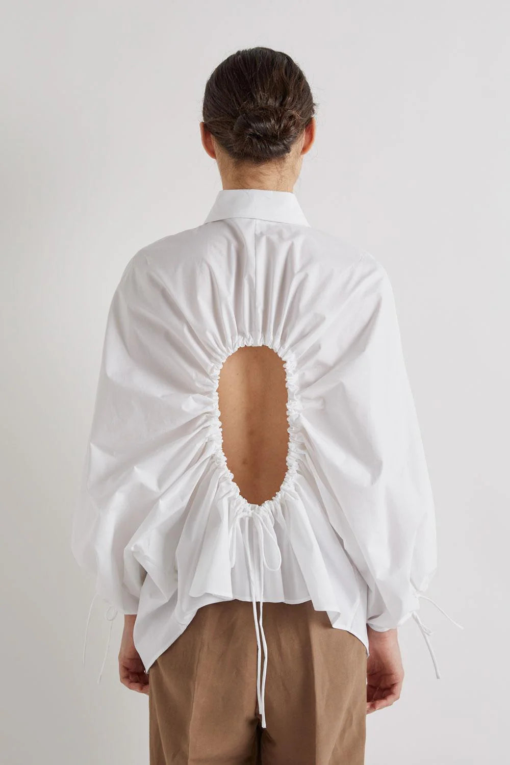 WIDE KIMONO SHIRT WITH DRAWSTRING AT THE BOTTOM OF THE SLEEVES AND HIDDEN FRONT CLOSURE. THE BACK FEATURES A GRIPPED OPENING THAT LEAVES PART OF THE BACK UNCOVERED.