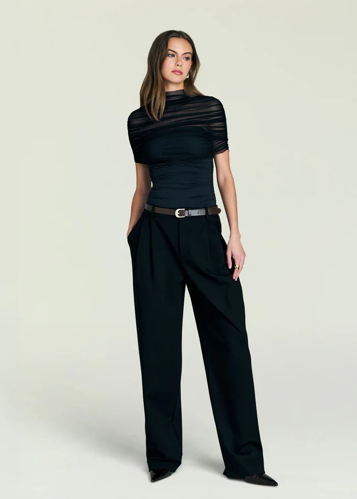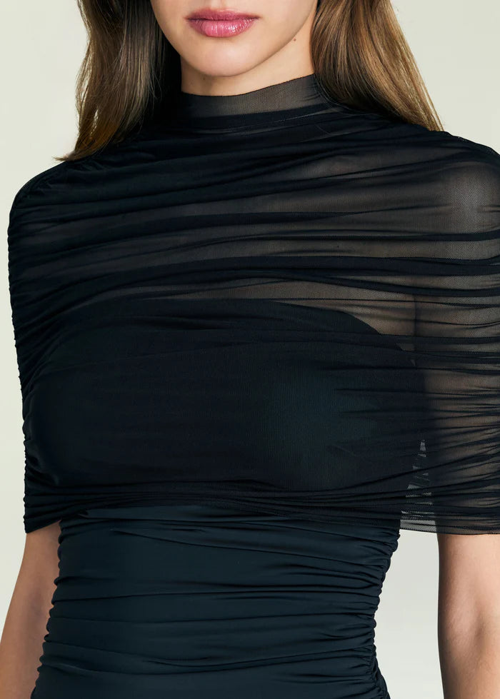 Strapless, fitted top with sheer, ruched overlay. Shown here in Black.