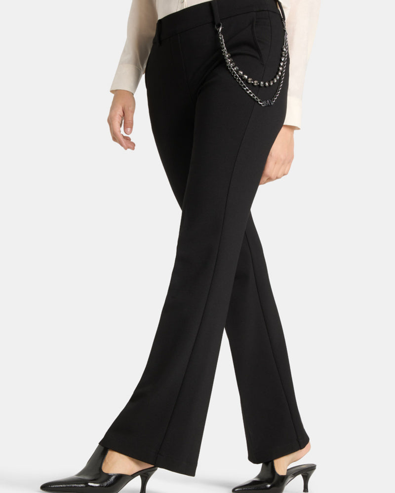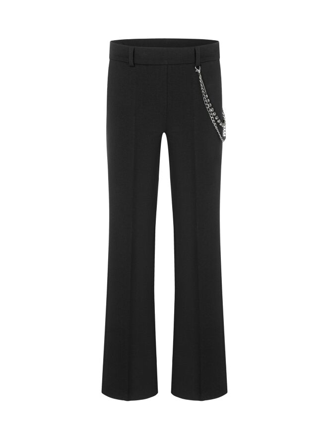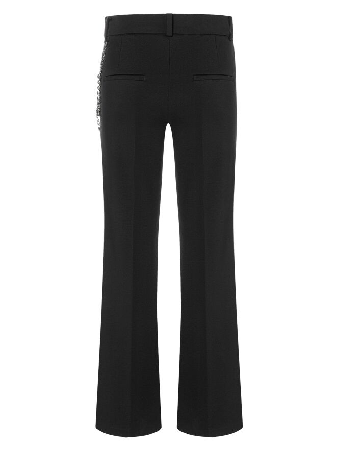 The waistband features a comfortable elastic band. On the left side, a double nickel-colored chain with rhinestones adds a luxurious detail. A pressed crease runs down the center of the legs, creating an elegant silhouette. The trousers also have practical slit pockets and can be hand-washed.