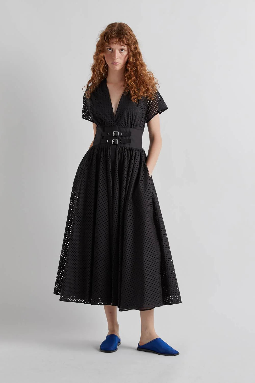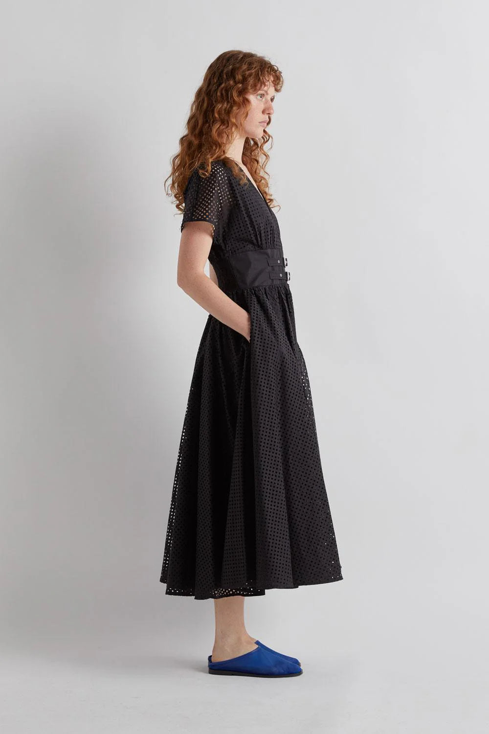 ANKLE-LENGTH DRESS WITH LASER-CUTTING, V-NECKLINE, SHORT SLEEVES, WAIST STRAPS AND BACK GATHERING