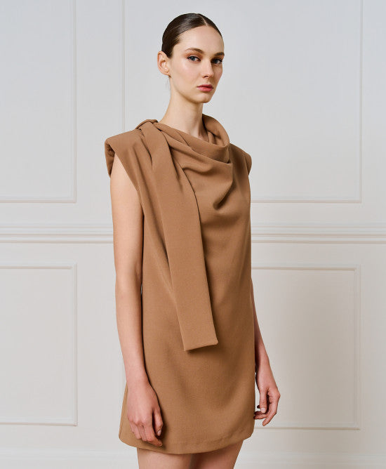 Sleeveless mini dress with a draped neckline and an integrated scarf. It features padded shoulders and a back button fastening. Choose it for stylish and chic all-day looks.