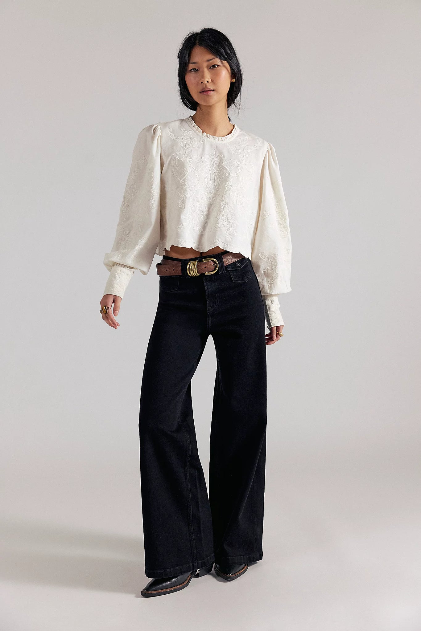 Fit: High-rise, ultra-wide-leg silhouetteFeel: Soft stretch denimFeatures: Zip fly and button closure, front pouch coin pockets, western-inspired yoke seam at back