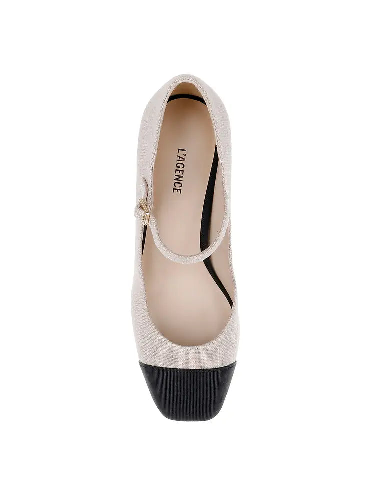 The ultimate Mary Jane style platform pump is back in neutral linen with a contrasting black cap toe. Finished with a chic square toe, this heel adds a retro Parisian flair to all of your outfits from dresses to jeans and trousers.
