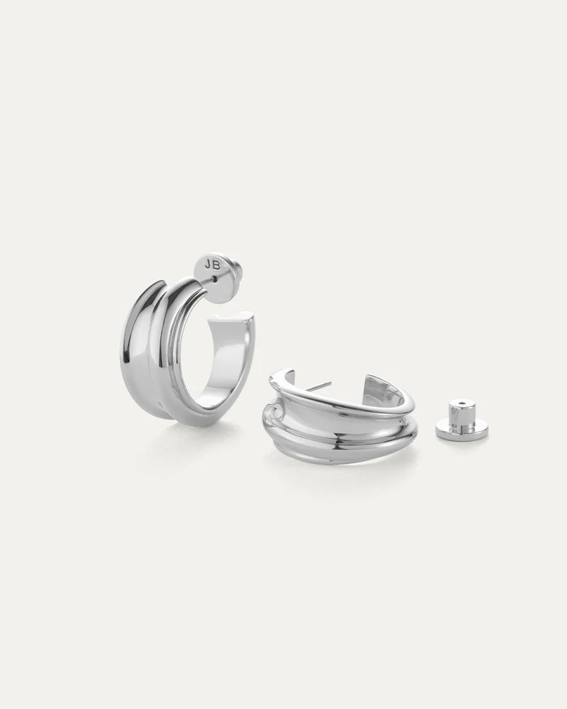 These silver hoop earrings boast deep contours. They are paired with Flat Disc Earring Backs for extra comfort. Finished in high-polish silver.