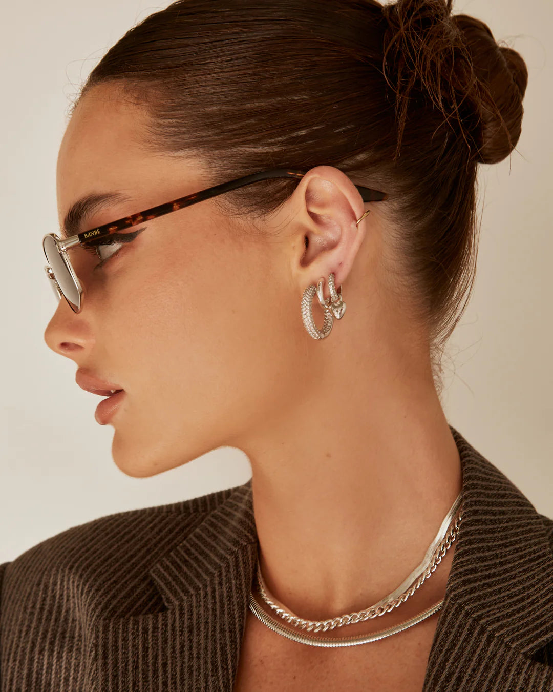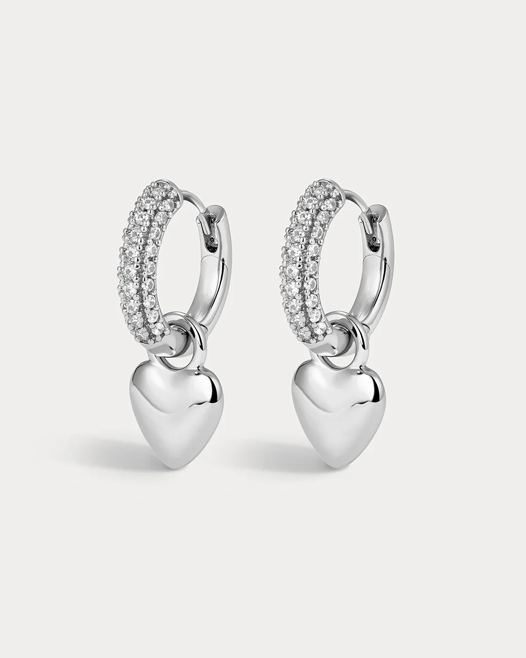 • Pair of pavè covered huggies with a metal puffy heart charm
