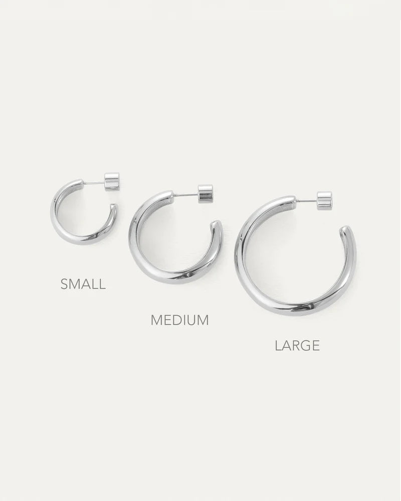 Their classic shape makes for your perfect medium hoop earrings. Wildly lightweight and water-resistant, they're sure to be your new go-to hoops. Finished in high-polish platinum.