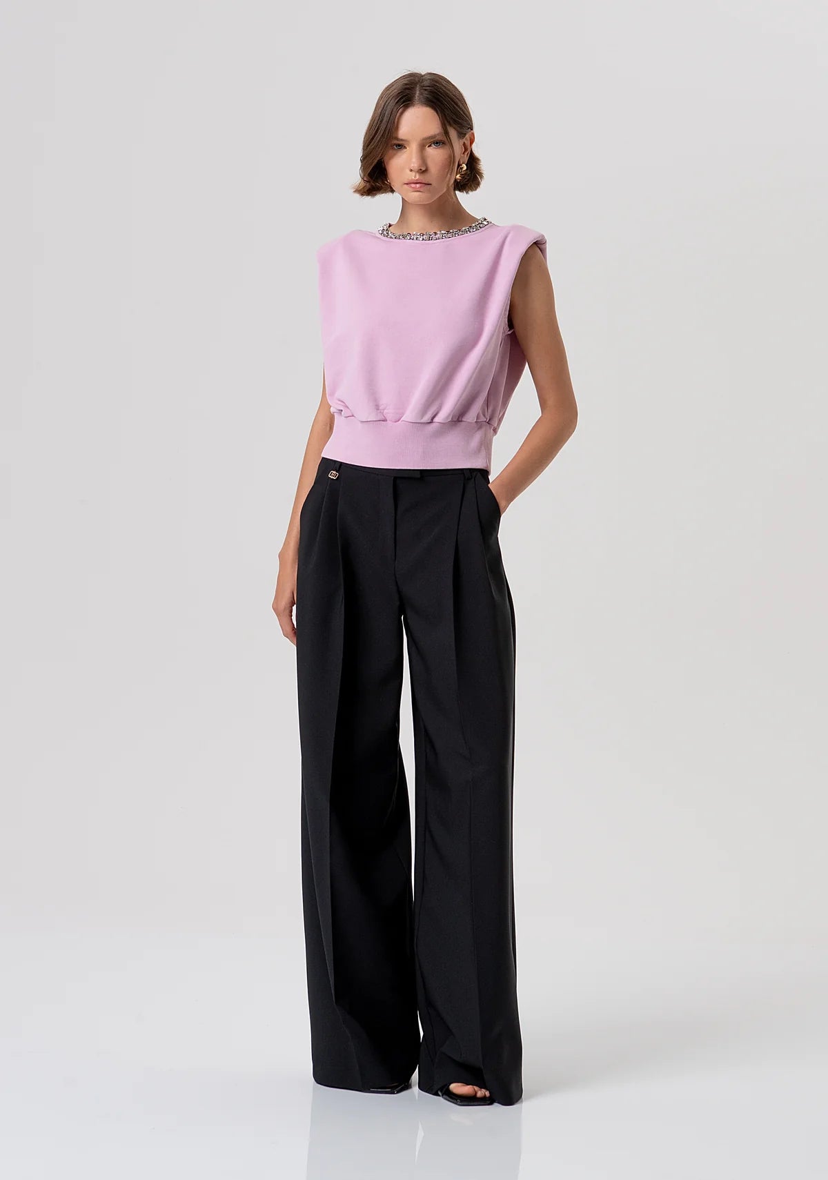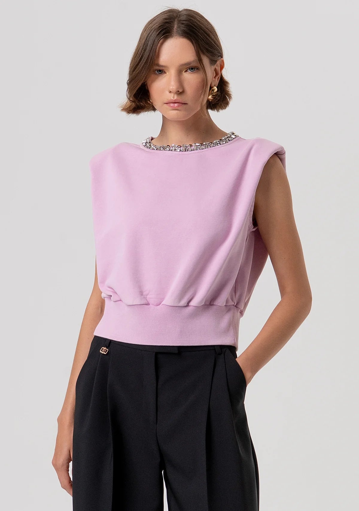 Sleeveless sweater with shiny stones. Round neck, zip at the back for opening and with shoulder pads.