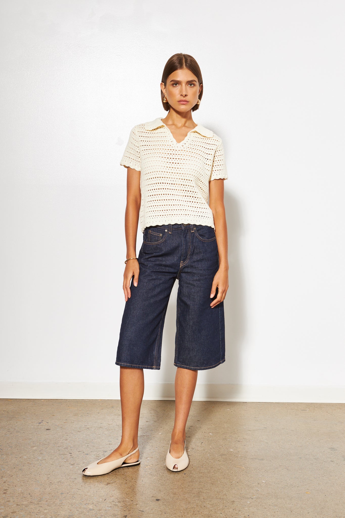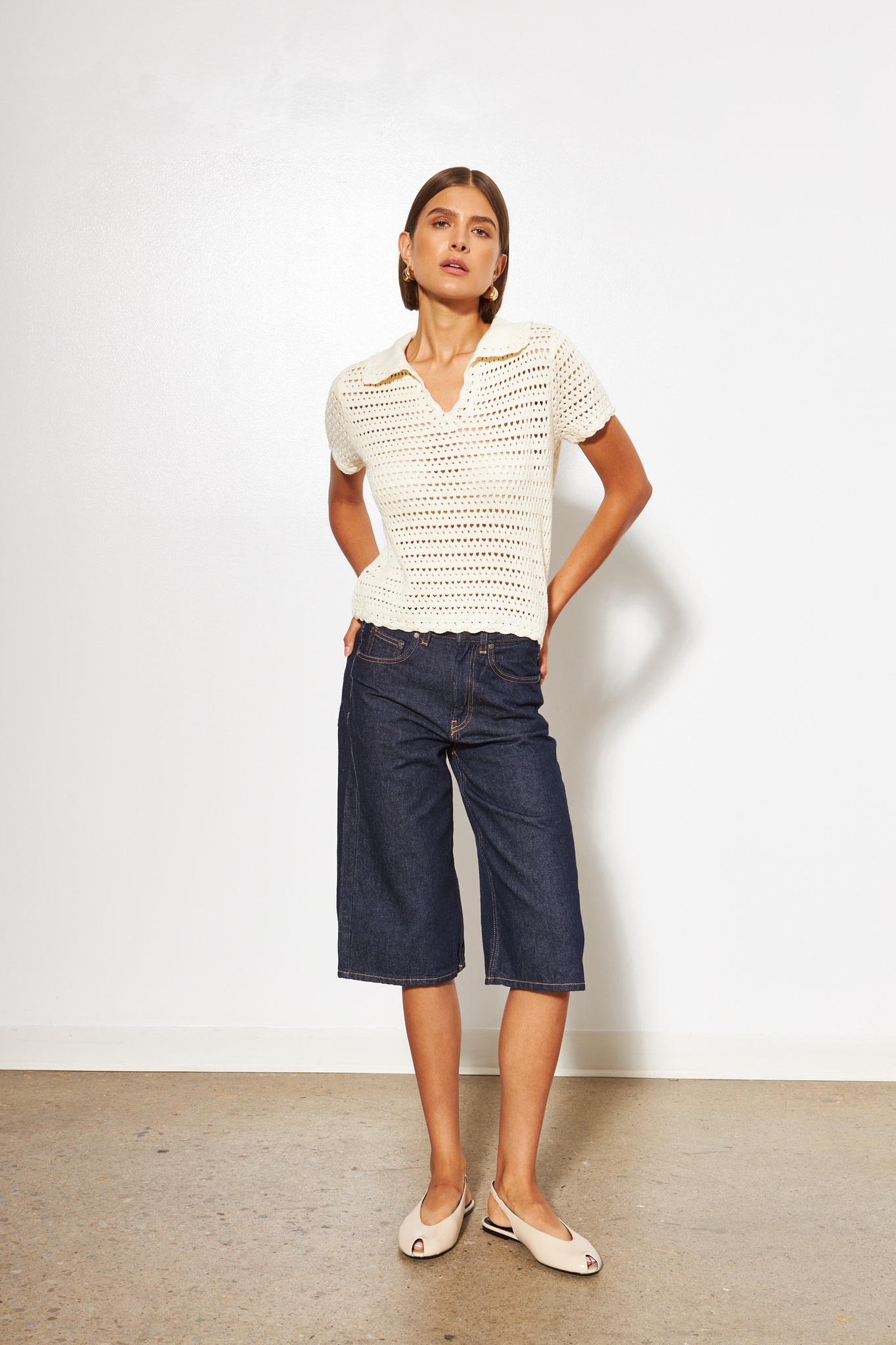 Collared Short Sleeve Open Knit Sweater.