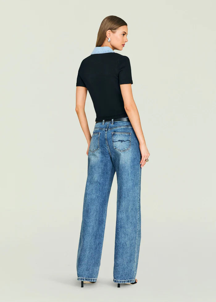 Short sleeve polo-style knit top with a button-up front and denim collar.