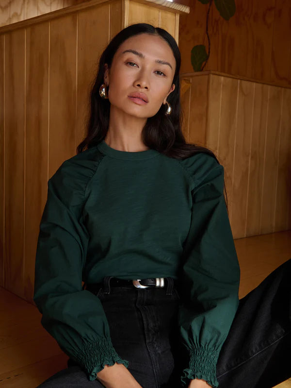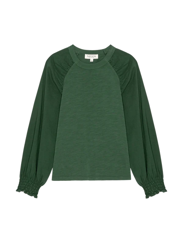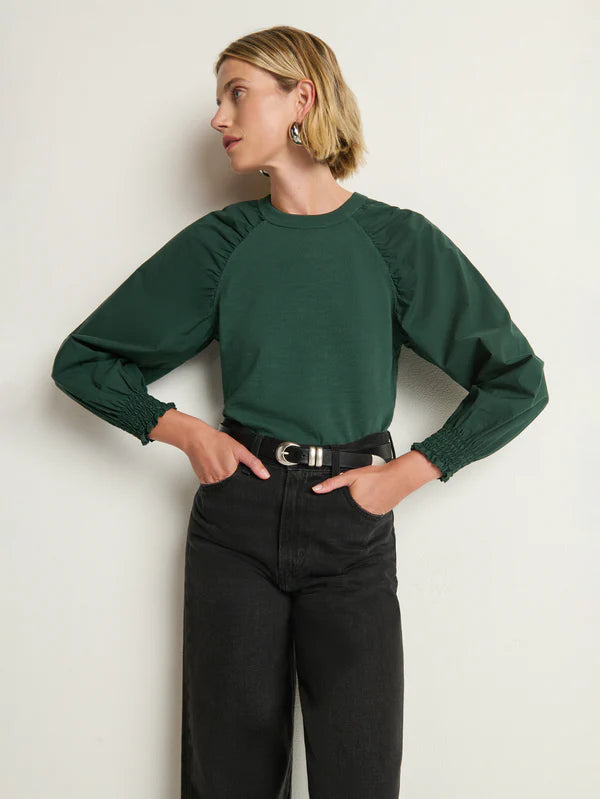 Details: Cuff detail, Multi-fabric construction, Shirring detail, Smocked detail