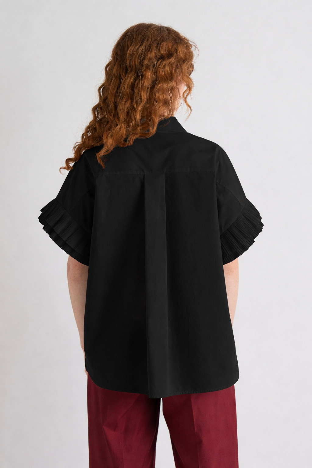 POLO STYLE SHIRT WITH PLEATED RUFFLE ON THE SLEEVE. ASYMMETRICAL ROUNDED HEM AND COUNTER-PLEAT ON THE CENTRE BACK.