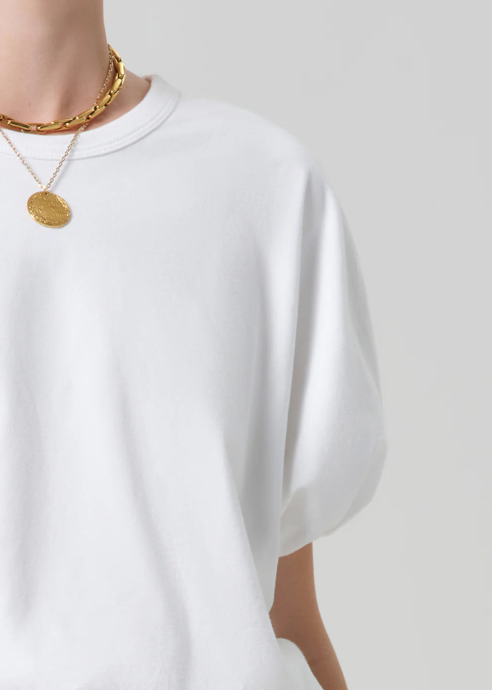 The Gia is a modern take on the classic tee, designed with a softly structured bubble silhouette and elastic hem. Crafted from lightweight, super-soft jersey cotton in clean white, it drapes effortlessly for an easy yet refined look—an everyday essential with a fresh edge.